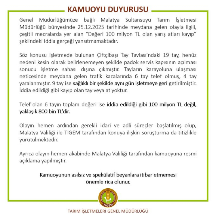 MALATYA (İGFA) - Tarım İşletmeleri Genel Müdürlüğü, Malatya Sultansuyu Tarım İşletmesi'nde 25 Aralık 2025'te yaşanan olayla ilgili bazı sosyal medya ve haber sitelerinde yayılan '100 milyon TL değerinde yarış atları kayıp' iddialarını yalanladı.