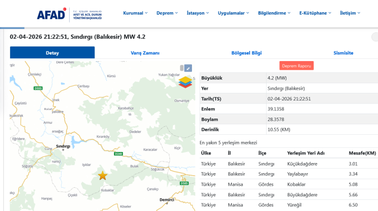 BALIKESİR (İGFA) - AFAD, saat 21:22'de Balıkesir'in Sındırgı ilçesinde 4,2 büyüklüğünde bir deprem meydana geldiğini duyurdu.