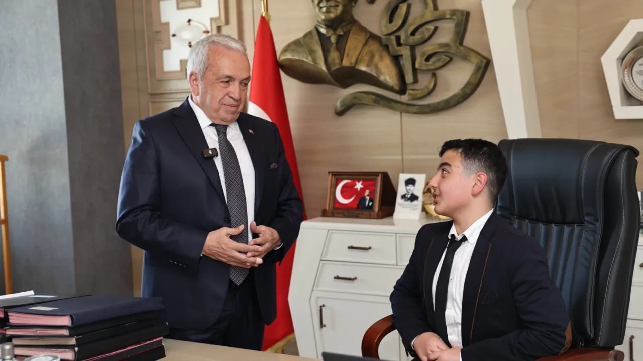 Bursa Nilüfer Belediye Başkanı Şadi Özdemir, 23 Nisan Ulusal Egemenlik ve Çocuk Bayramı nedeniyle Başkanlık makamını sembolik olarak Cavit Çağlar Ortaokulu 7’nci sınıf öğrencisi Celal Aras Erten’a bıraktı. Erten, okullardaki eksikliklerin giderilmesi ve temiz çevre için hassas olunması talimatları verdi.BURSA (İGFA) - 23 Nisan Ulusal Egemenlik ve Çocuk Bayramlarının bir geleneği olan, yöneticilerin makamlarını çocuklara devretmesi Nilüfer’de de güzel anlara sahne oldu. Nilüfer Belediye Başkanı Şadi Özdemir de makamını ortaokul öğrencisi Celal Aras Erten’e devretti.