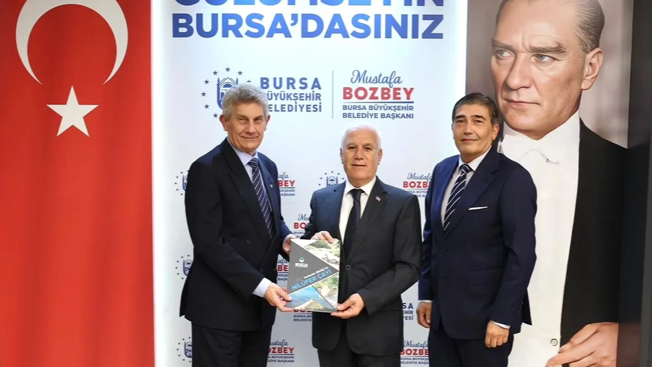 Bursa Sanayicileri ve İş İnsanları Derneği (BUSİAD) Yönetim Kurulu Başkanı Buğra Küçükkayalar ve Yönetim Kurulu Üyesi Hüsamettin Çoban, Bursa Büyükşehir Belediye Başkanı Mustafa Bozbey'i makamında ziyaret ederek, 'Herkesin Bildiği Sır-Nilüfer Çayı' raporunu ilettiler.