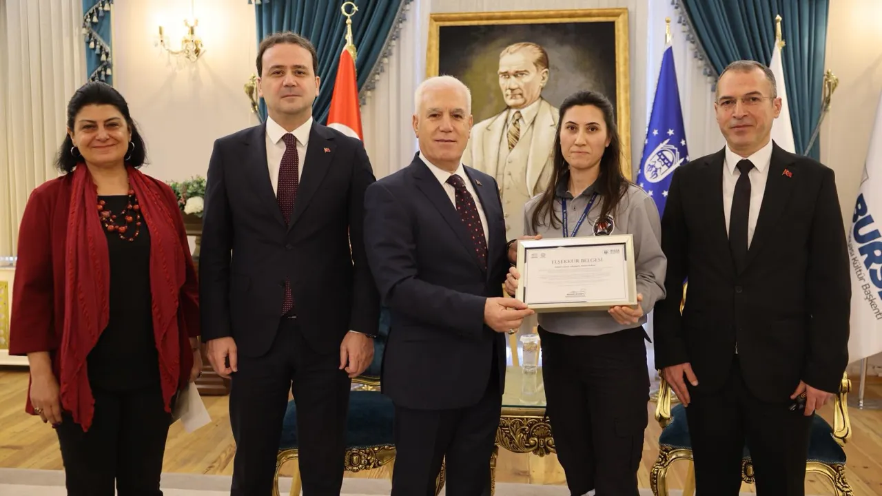 Büyükşehir Belediye Başkanı Mustafa Bozbey de güvenlik görevlisi Fatma Yılmaz'ı, Tarihi Belediye Binası'nda ağırlayarak teşekkür belgesi verdi.