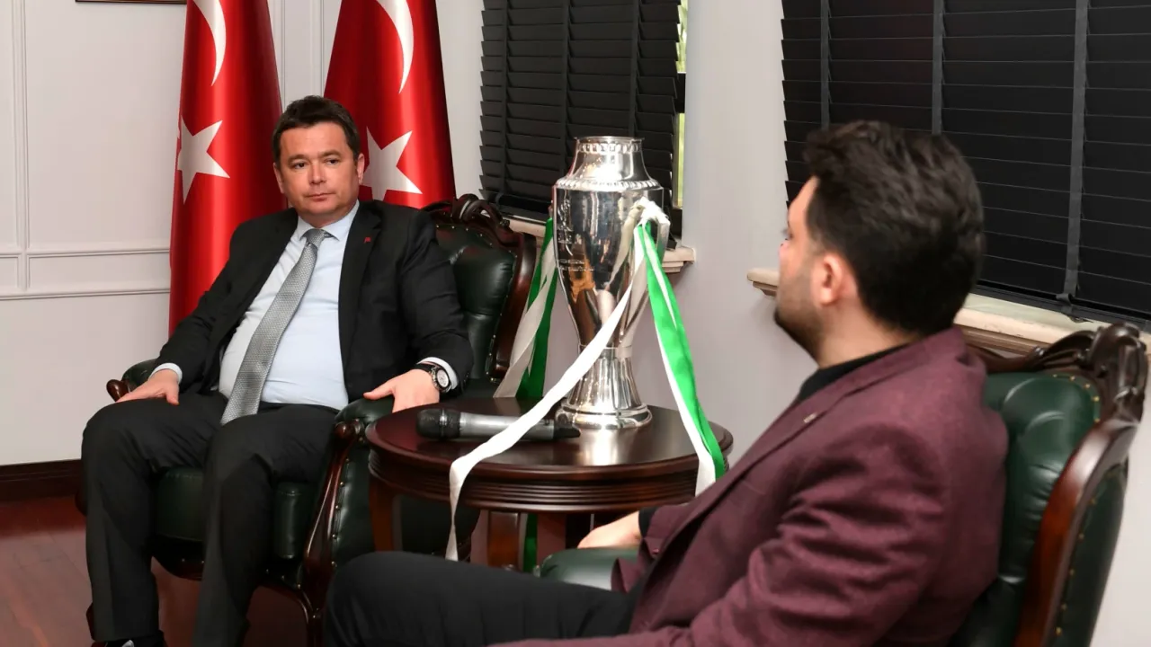 Osmangazi Belediye Başkanı Erkan Aydın, Bursaspor Başkanı Enes Çelik ve yönetim kurulu üyelerini başkanlık makamında şampiyonluk kupasıyla ağırladı. Başkanlar şampiyonluk kupasını beraber kaldırarak hatıra fotoğrafı çektirdi.