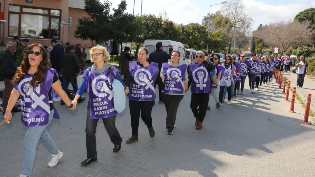 Kadınların emek ve özgürlük mücadelesinin sembol günü Dünya Emekçi Kadınlar Günü’nde Efes Selçuk’ta düzenlenen etkinliklerle farkındalık oluşturuldu.İZMİR (İGFA) - Efes Selçuk Belediyesi ve Efes Selçuk Kadın Platformu iş birliğiyle “Direnen ve Üreten Kadınlar” teması ile düzenlenen etkinlikler kapsamında 8 Mart Dünya Emekçi Kadınlar Günü’nde Atatürk Anıtı önünde bir araya gelen kadınlar Kadın Zinciri oluşturarak sloganlarla yürüyüş yaptılar.