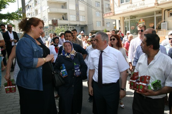 Yürüyüş sırasında tekstil atölyelerine de uğrayan Başkan buradaki hanımlara fesleğen hediye etti.