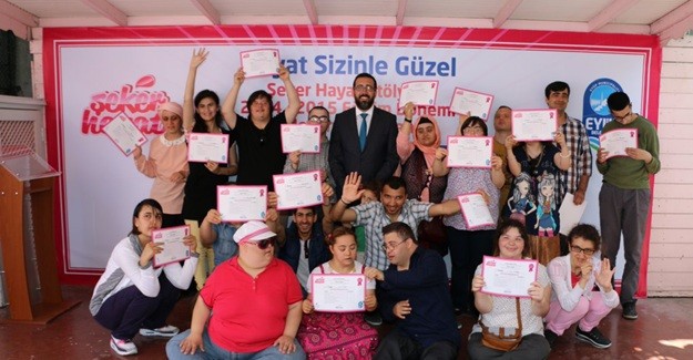 Düzenli ve aktif olarak okula devam eden 80 öğrencinin karne aldığı tören Eyüp Belediye Başkanı Remzi Aydın, eşi Tülay Aydın, Başkan Yardımcıları Şengül Kocabaş ve Ahmet Turan Koçer ile Eyüp Belediyesi Sosyal Destek Hizmetleri Müdürü Erhan Angın’ın katılımıyla Şeker Hayat’ın bahçesinde gerçekleştirildi. Tören öncesinde çalınan şarkılarla özel çocuklar dans ederek doyasıya eğlendi.