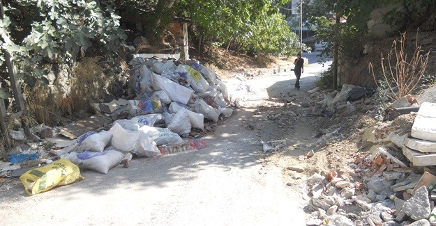 Bir çok yayanın ve aracın geçtiği yol kenarındaki kaldırımlara dökülen inşaat atık ve molozlarlar araç yoluna taşması nedeniyle araç ve yaya geçişine engel oluyor.Yol kenarında yıkılan Gecekonduların harfiyatlarının da gelişigüzel çevreye dapıldığı görlmektedir.Yola taşan molozlar vatandaşın tepkizine neden oluyor.