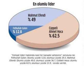 Adı en çok duyulan Fethullah Gülen Adını en fazla duyduğumuz cemaat hangisi, sorusuna 'Gülen Cemaati' cevabı verenlerin oranı yüzde 30.1 oldu. Bunu 'Süleymancılar' yüzde 19, 'Nur cemaati' yüzde 17.3, 'Nakşibendiler' yüzde 5.9, 'İsmailağa Cemaati' yüzde 2.8, 'Cübbeli Ahmet Hoca cemaati' yüzde 2.4 olarak izledi. "Adını bildiğimiz herhangi bir dini cemaat lideri var mı" sorusuna 'Fethullah Gülen' yüzde 60.6, 'Mahmut Efendi' yüzde 7.4, Cübbeli Ahmet Hoca da yüzde 1.5 olarak çıktı.
