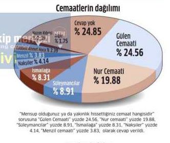 12 milyon kendini cemaat üyesi sayıyor Araştırmaya göre 'cemaatlere biraz yakınlığım var' ya da 'herhangi bir cemaat mensubum' diyenlerin toplam oranı yüzde 16. Araştırmacılar bu durumu şöyle yorumluyor: bu oran 75 milyonluk bir nufus üzerinden yaklaşık olarak 12 milyona tekabül eder. Bu sayı ağırlıklı olarak Nur cemaatinde yoğunlaşmaktadır. Cemaat mensuplarını yüzde 25'i Fethullah Gülen, yüzde 20'si de Nur cemaatine bağlıdır.
