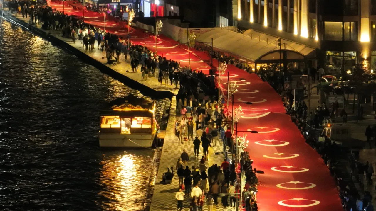 Kortej, Konak Pier önünde 350 metrelik Türk bayrağı ve fener alayı ile birleşti. Bandonun çaldığı marşlar eşliğinde kortej Cumhuriyet Meydanı'na doğru devam etti. Meydanda yapılan havai fişek gösterisi fener alayı yürüyüşüne renk kattı. Cumhuriyet coşkusu, saat 21.00'de Gündoğdu Meydanı'nda düzenlenen Haluk Levent konseri ile doruğa çıktı.