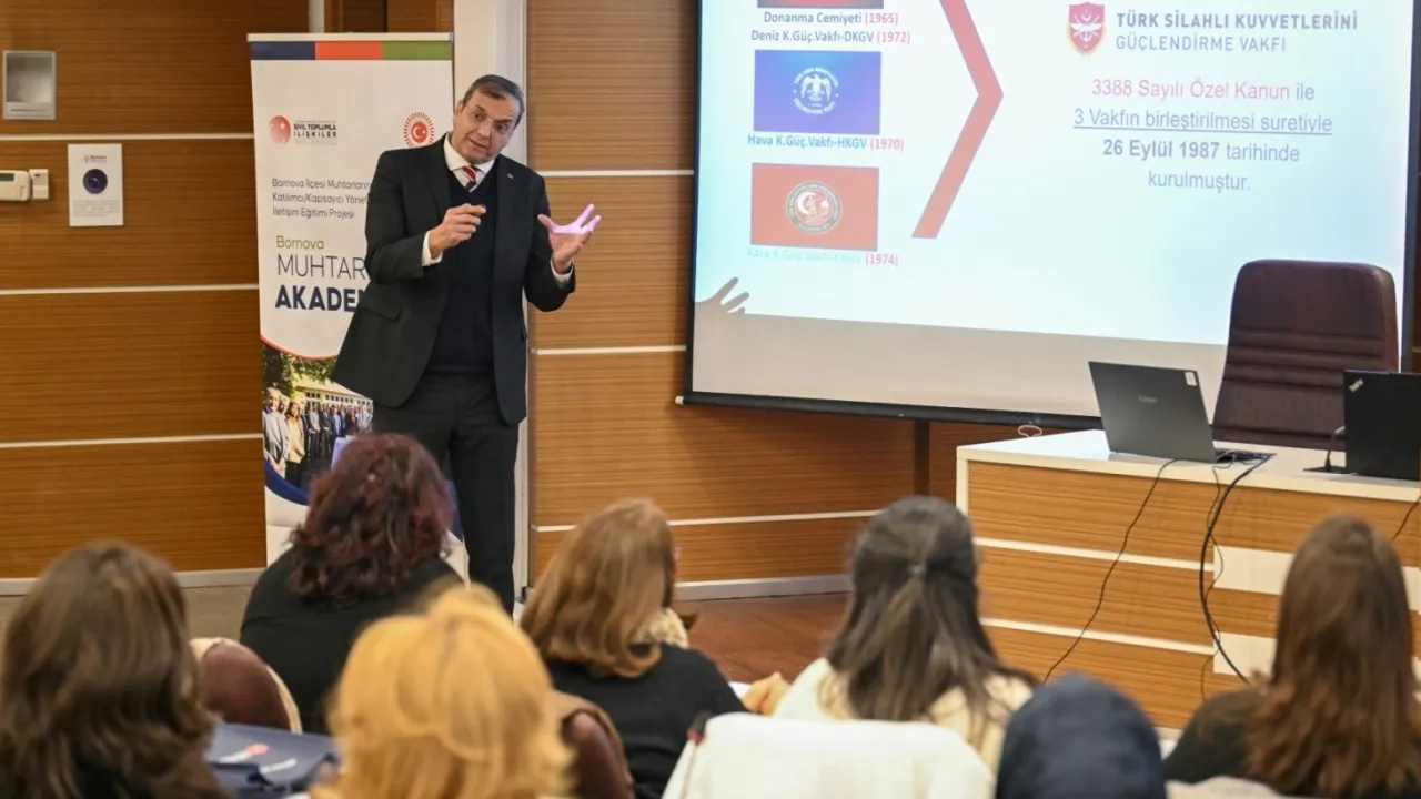 Eğitimin ilk bölümünde Türk Silahlı Kuvvetleri'ni Güçlendirme Vakfı İzmir Bölge Temsilcisi Emekli Albay Orhan Kadir Gök, vakfın kuruluş amacı ve faaliyetlerine ilişkin bir sunum yaptı. Ardından Bornova Belediyesi Muhtarlık İşleri Müdürü Şahin Doğan, 2025 yılında Bornovalı muhtarlara yönelik gerçekleştirilen faaliyet, çalışma ve destekleri aktarırken, 2026 yılı planlarını paylaştı.