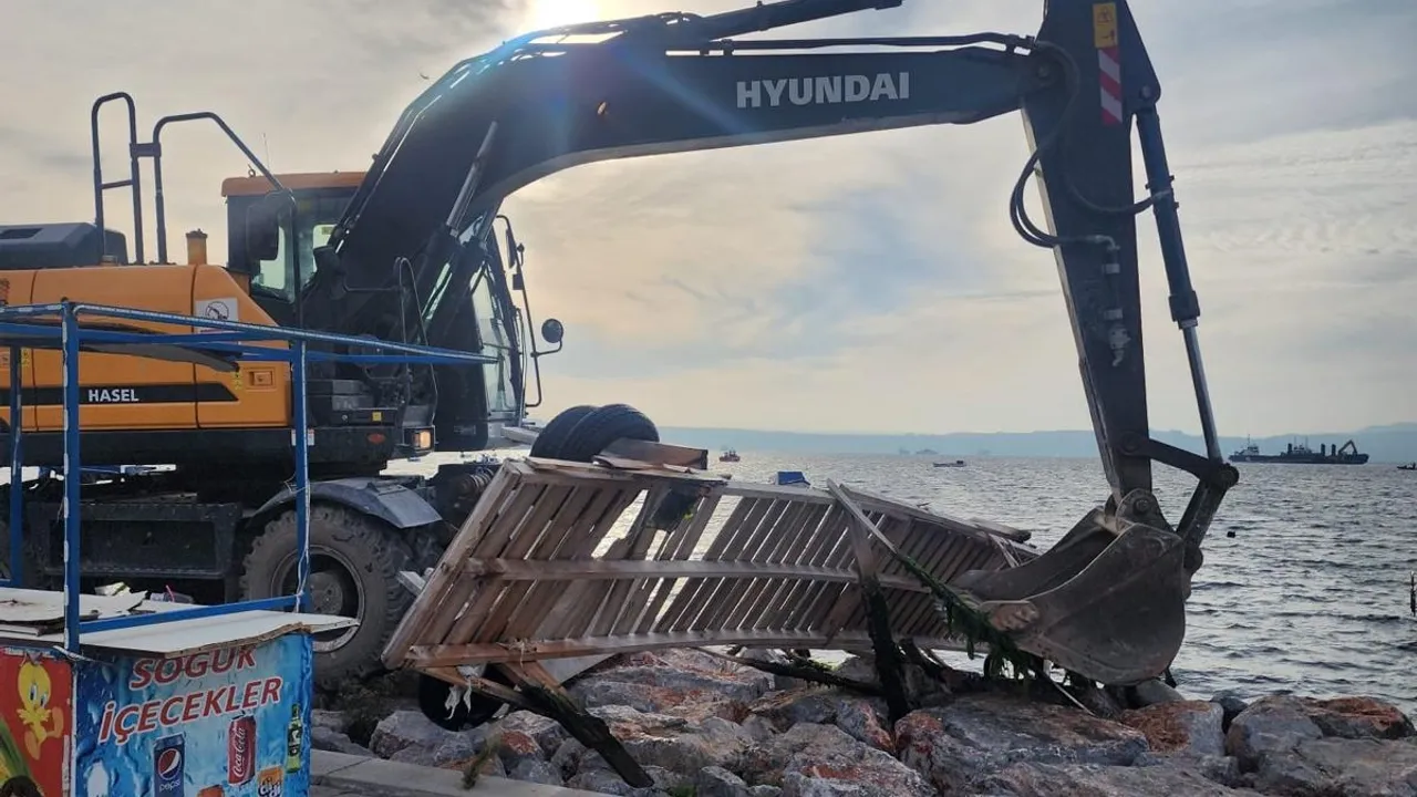 İzmir Büyükşehir Belediyesi, Karşıyaka sahilinde Kıyı ve İmar Kanunu'na aykırı şekilde inşa edilen izinsiz platform ve ahşap iskelelerin yıkımına başladı.