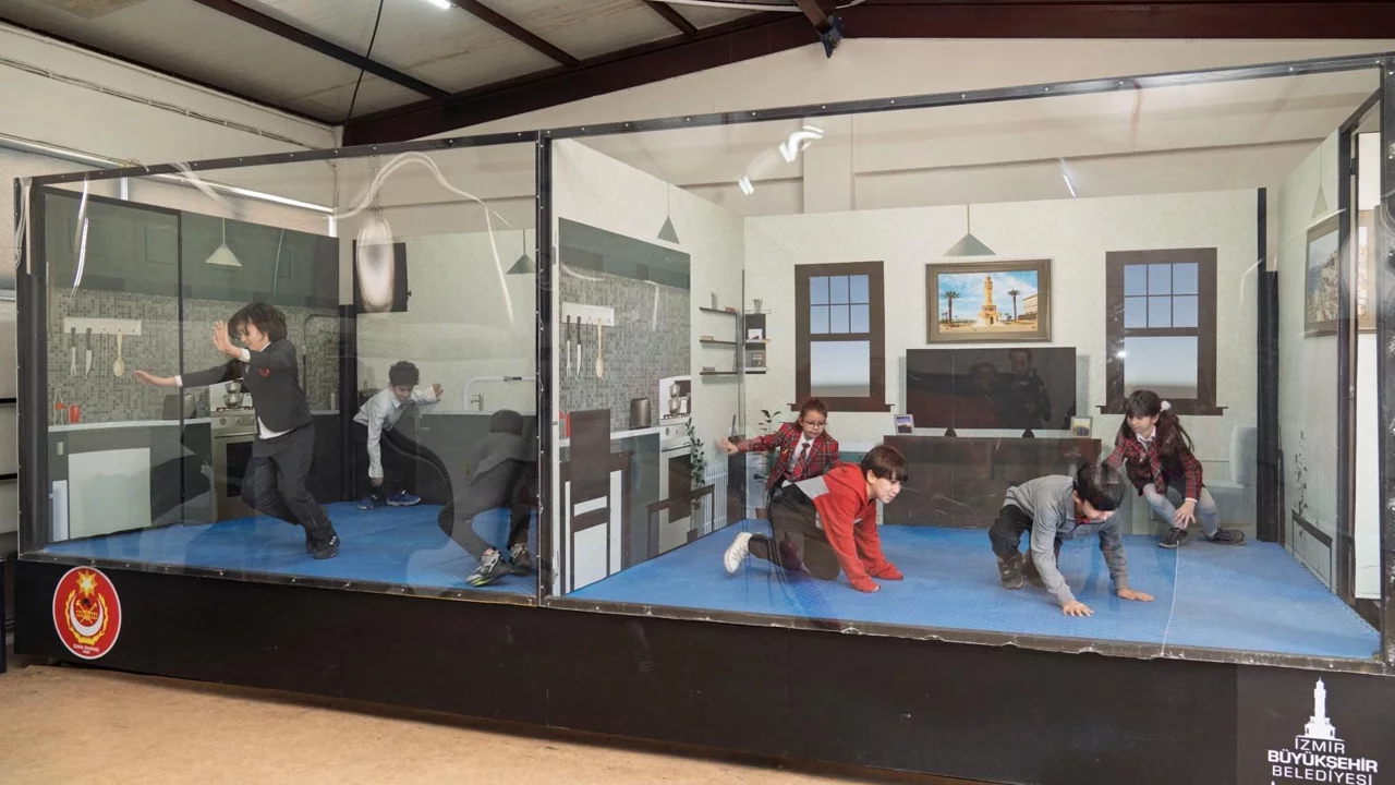 İzmir Büyükşehir Belediyesi İtfaiye Dairesi Başkanlığı bünyesinde geliştirilen Sanal Gerçeklik Tabanlı Deprem Simülasyonu, katılımcılara sarsıntı anını gerçeğe en yakın haliyle yaşatıyor.