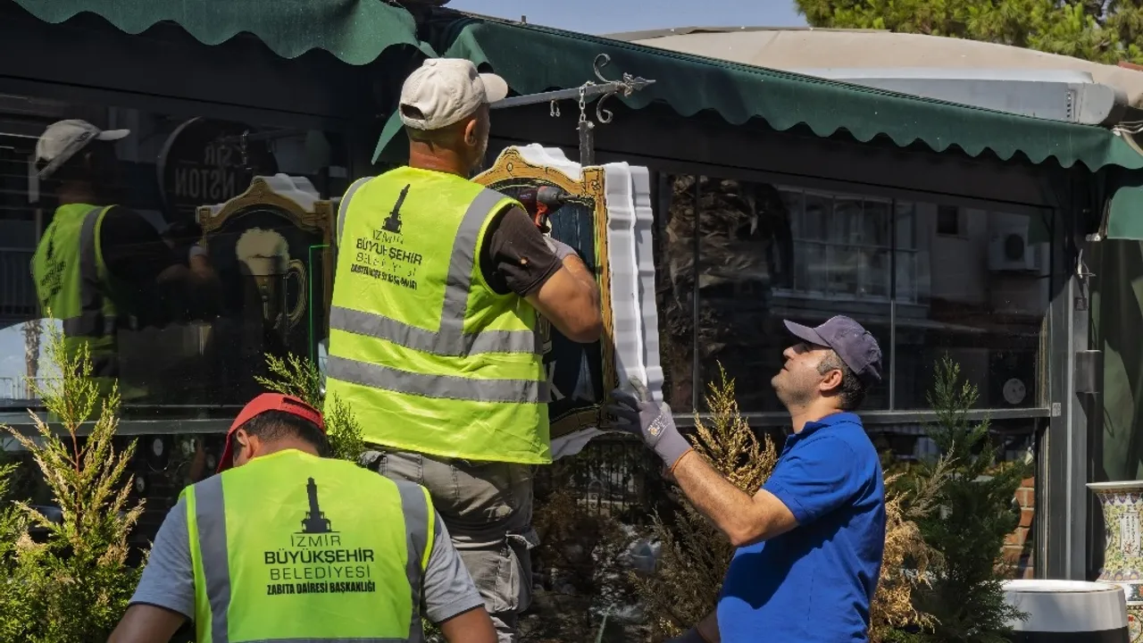 İzmir Büyükşehir Belediyesi Zabıta Dairesi Başkanlığı Denetim Şube Müdürlüğü ekipleri, Güzelyalı’daki işletmeler tarafından hizmet alanına çevrilen yeşil alanlara yönelik çalışma yürüttü. Bölge esnafının da iş birliği ile yeşil alanlardaki işgaller kaldırıldı.İZMİR (İGFA) - İzmirli esnaf, İzmir Büyükşehir Belediyesi Zabıta Dairesi Başkanlığı Denetim Şube Müdürlüğü ile iş birliği içinde önemli bir çalışmaya imza attı.