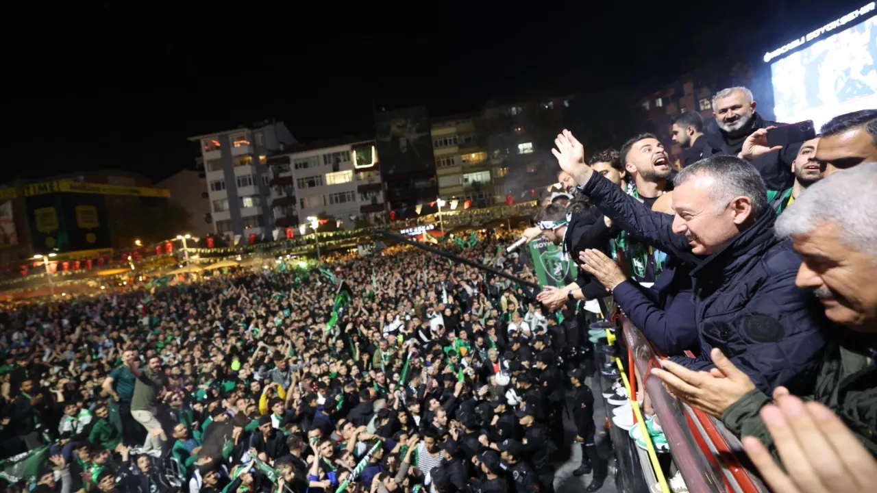 Kent Meydanı’nı dolduran binlerce Kocaelili 16 yıl sonra Süper Lig’e yükselen şehrin takımı Kocaelispor’u bağrına bastı. İstanbul’daki Esenler Erokspor karşılaşmasının ardından Kuruçeşme gişelerinde karşılanan Yeşil-Siyahlılar, buradan konvoy eşliğinde, üstü açık otobüs ile İzmit Kent Meydanı’na geldi. Takımı karşılayan ilk isim Kocaeli Büyükşehir Belediye Başkanı Doç.Dr.Tahir Büyükakın oldu.