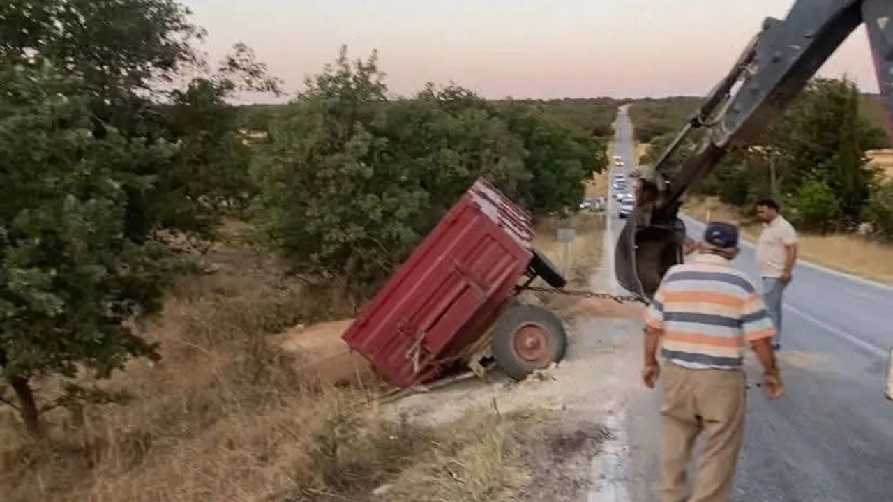 Edirne'de Keşan-Enez karayolunda buğday yüklü traktörün devrilmesi sonucu buğdaylar yola saçıldı. Sürücü yara almazken, kaza bölgesi kepçe yardımıyla temizlendi. Yol, sık sık kazalarla gündeme geliyorErdoğan DEMİR / EDİRNE (İGFA) - Keşan-Enez karayolunda bir kaza daha yaşandı. Kocaali Köyü’nden H.K.’nin kullandığı buğday yüklü traktör, Büyükevren Gökgür rampası mevkisinde kontrolden çıkarak devrildi. Römorkun yan yatmasıyla buğdaylar yola saçıldı. Şans eseri sürücü yara almadı, ancak römorkta hasar oluştu.