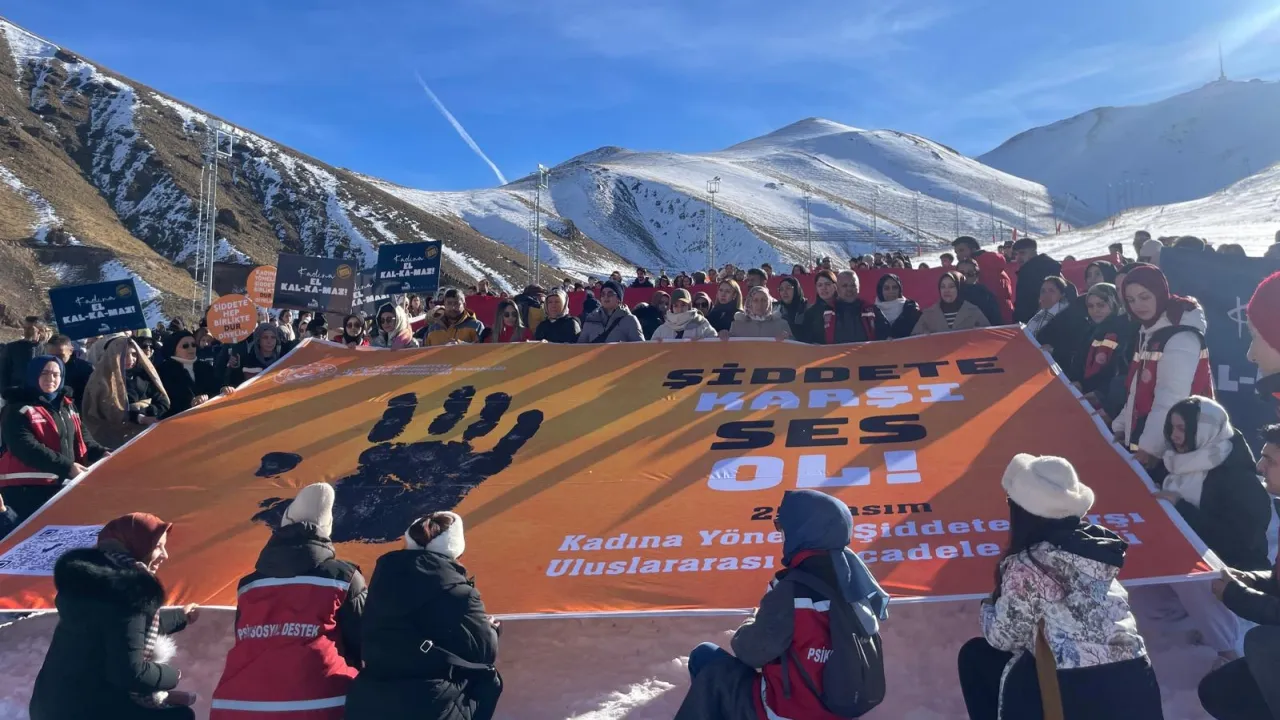 Erzurum Aile ve Sosyal Hizmetler İl Müdürlüğü koordinasyonunda Palandöken Kayak Merkezi'nde düzenlenen 'Şiddete Karşı Tek Yürek Yürüyüşü', kamu kurumları, STK'lar ve vatandaşların katılımıyla kadına yönelik şiddete karşı güçlü bir farkındalık mesajı verdi.